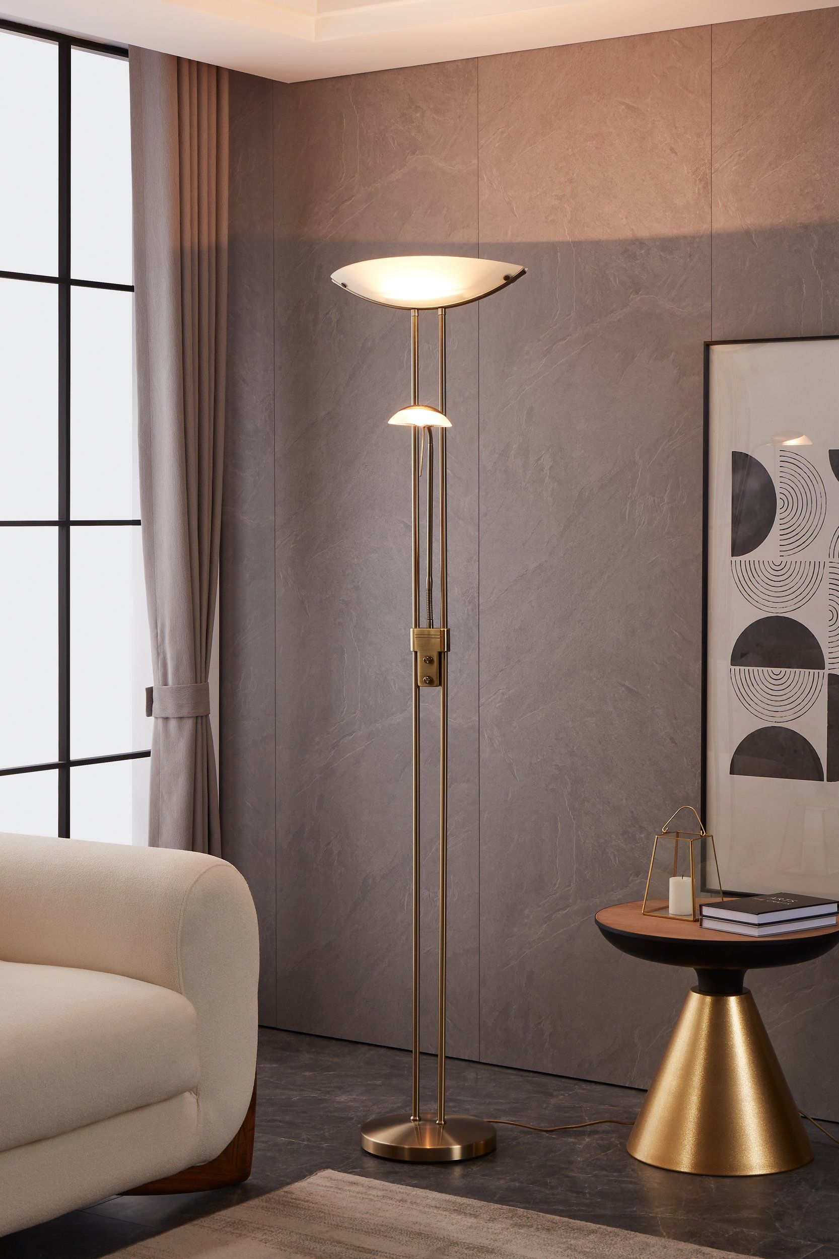 La piantana BAYA a LED unisce funzionalità e stile grazie alla struttura in metallo brunito e ai dettagli in vetro satinato bianco. La luce principale proietta un’illuminazione indiretta verso il soffitto, mentre il faretto flessibile, perfetto per la lettura, offre una luce direzionale. I due punti luce sono regolabili e gestibili separatamente tramite interruttori integrati. Ideale per ambienti moderni, questa lampada è perfetta per il soggiorno o la camera da letto, offrendo un’illuminazione versatile e accogliente. Le lampadine a LED incluse garantiscono una luce bianca calda e un’elevata efficienza energetica.
