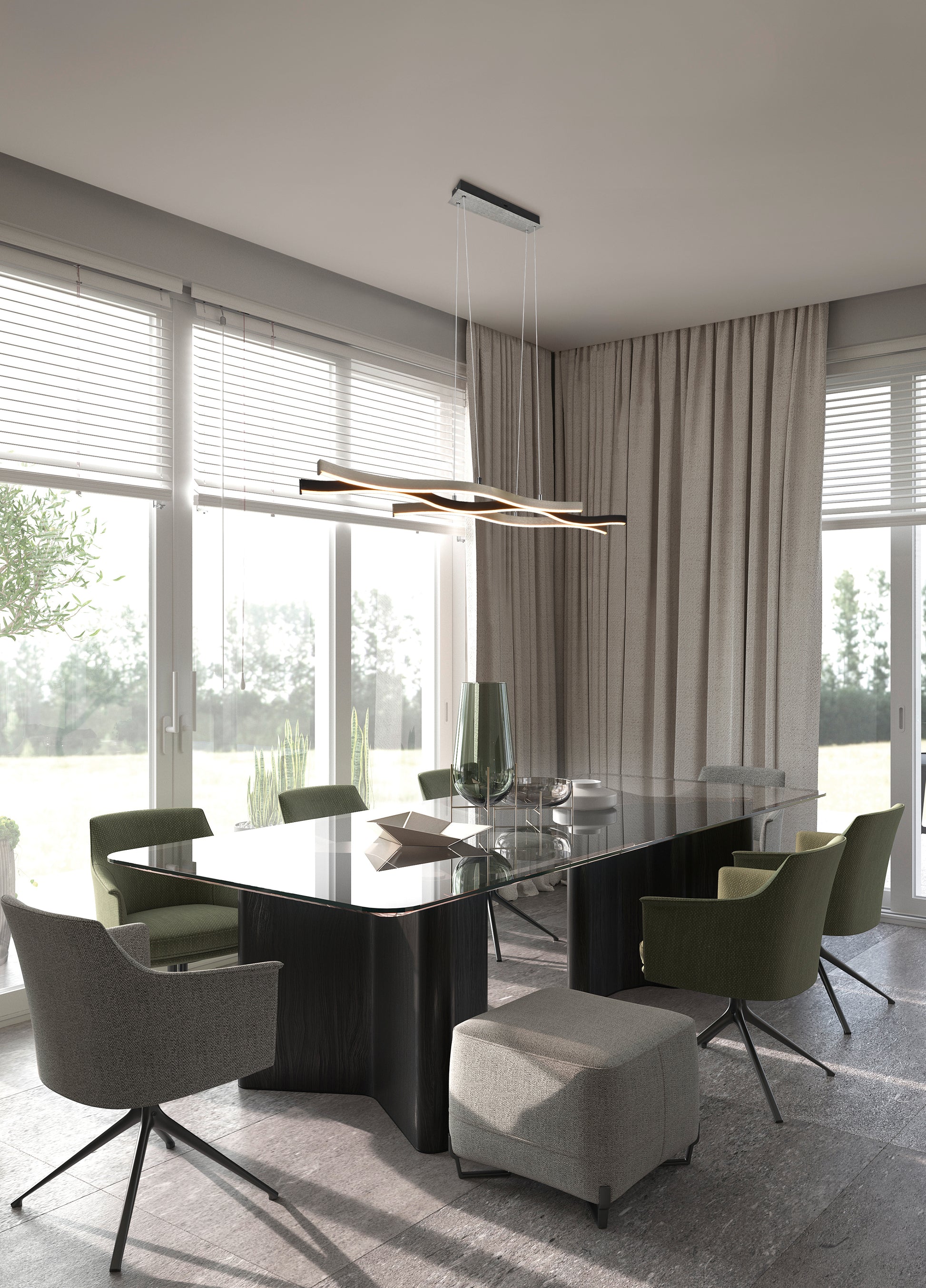 La forma curva della lampada a sospensione BLAZE crea una scenografia elegante per la zona pranzo, diventando un vero richiamo visivo sopra il tavolo. Questo apparecchio, moderno e raffinato, è dotato di un dimmer SWITCH, che permette di regolare la luminosità su tre livelli: 100%, 50% e 25%, utilizzando un semplice interruttore. Inoltre, offre la possibilità di scegliere tra diversi colori della luce: bianco caldo, bianco neutro e bianco luce diurna. Il design è completato dalla combinazione di alluminio spazzolato e nero opaco, che si integra facilmente in ambienti contemporanei. Grazie alla tecnologia LED, garantisce un’elevata qualità della luce e una notevole efficienza energetica, consentendo un risparmio energetico fino all’80% rispetto alle lampade alogene. Le sorgenti luminose a LED offrono una lunga durata, una bassa generazione di calore e un minore impatto ambientale.