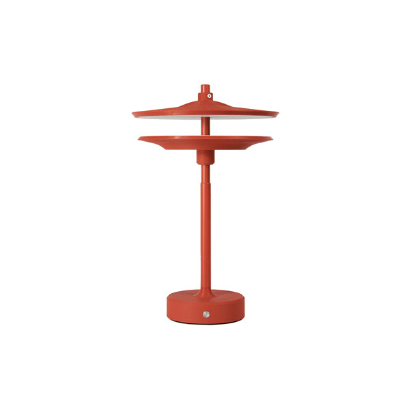 Grazie alla manopola filettata è possibile regolare l’altezza del piatto inferiore e modulare la luce riflessa a piacere. L’asta centrale in alluminio, la regolazione touch e la spia luminosa di carica completano un progetto che si distingue per cura artigianale e tecnologia smart.