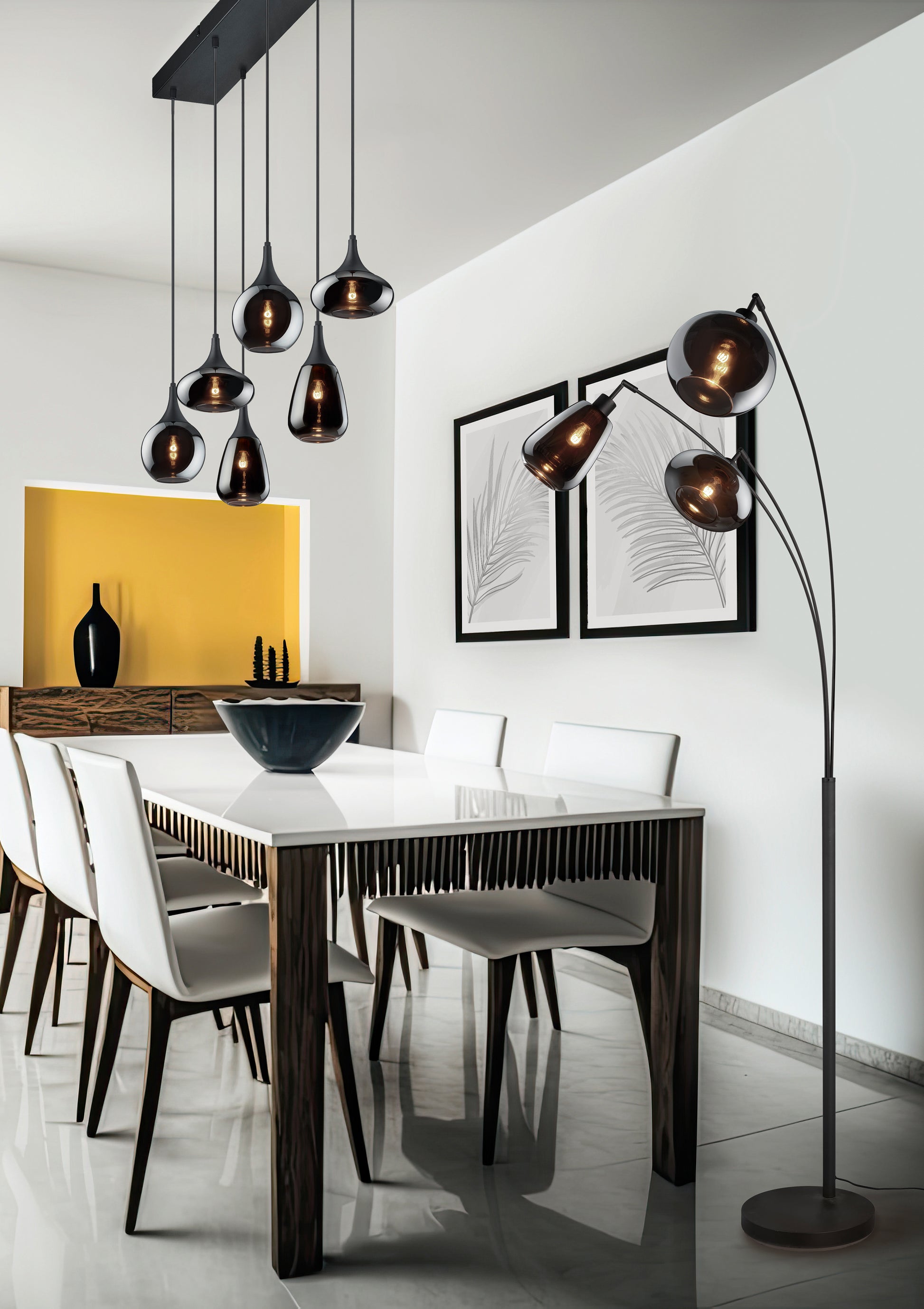La lampada da terra LUMINA, con i suoi eleganti paralumi in vetro, diventa un punto focale di stile nella vostra zona giorno. La combinazione delle diverse forme dei tre paralumi e dei materiali come metallo e vetro crea un'atmosfera luminosa unica, aggiungendo un tocco di modernità agli spazi abitativi. Grazie al colore nero opaco e ai paralumi in vetro cromato evaporato, questa lampada si adatta perfettamente a diversi concetti di design ed è facilmente integrabile in ambienti già arredati. Per un'illuminazione a risparmio energetico, si consiglia l'utilizzo di sorgenti luminose a LED, che rappresentano un'alternativa ideale alle tradizionali lampade alogene. I LED offrono un'elevata qualità della luce, un risparmio energetico fino all'80%, e vantaggi come una lunga durata, una bassa emissione di calore e un minor impatto sull'ambiente.