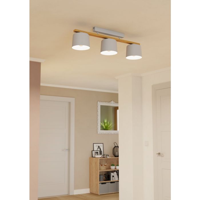 La plafoniera MARIEL si caratterizza per un design moderno e accogliente. È composta da una base in metallo grigio chiaro e un supporto in legno marrone al quale sono fissati tre paralumi rotondi in tessuto grigio chiaro. Il mix di materiali, legno e tessuto, la rende perfetta per arredamenti contemporanei, offrendo un'illuminazione calda e raffinata in soggiorno, camera da letto o corridoio. (Le lampadine non sono incluse; la lampada è compatibile con qualsiasi lampadina con attacco E27).